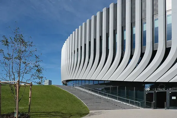 Its distinctive facade, characterized by vertical lamellas, creates a sense of dynamic movement while providing essential solar shading and natural ventilation.Prioritizing sustainable architecture, the arena is topped with an expansive green roof that enhances local biodiversity and seamlessly integrates the structure into the surrounding parkland.
