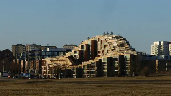 To maximize natural daylight influx and offer panoramic views towards Gärdet and the nearby Frihamnen port, the building's tallest corner reaches 35 meters. This design not only enhances the residents’ living experience but also pays respect to the natural aesthetics of the surrounding park and the broader urban setting.
