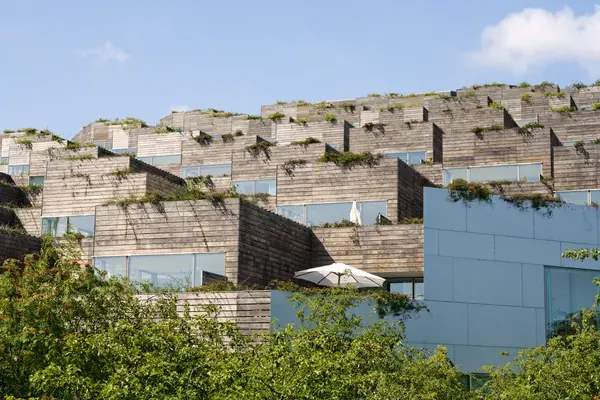 These are terraces filled with plants that come from the American prairie. This draws bees, birds, and butterflies to the building. It also helps manage stormwater by catching rainwater which is then treated and saved for later use; about 4.5 million gallons every year! BIG's designs support water conservation, biodiversity, and eco-restoration efforts by using native plant species in sustainable landscaping ideas.