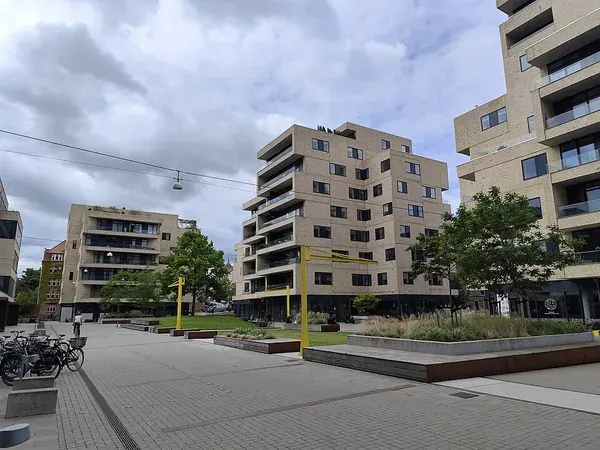 The development combines high-quality residential apartments with premium commercial office space and retail units, arranged around a central, sunny public plaza.The architecture features a dynamic composition of building heights, ranging from townhouses to striking high-rise towers, all utilizing classic brickwork to honor the local context.