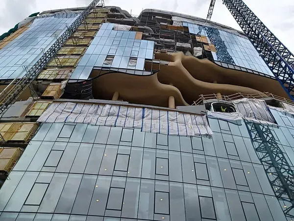 The center's design is fresh and wavy with modern parts that blend well with nature. New photos show that work on the center is almost done.