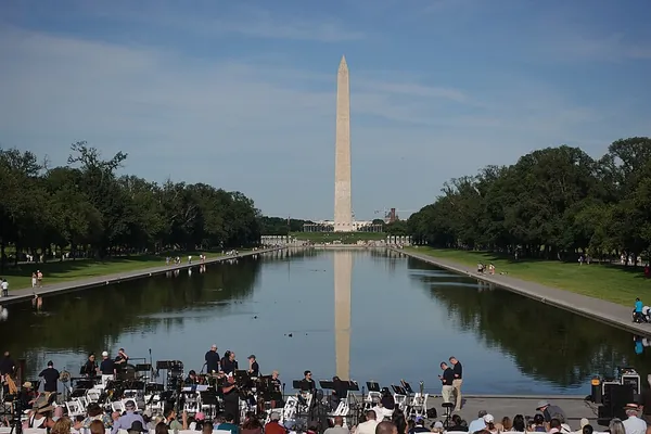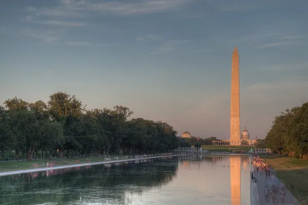 The reflecting pool mirrors the grandeur of the monument, offering visitors a place to reflect amidst the bustling city.