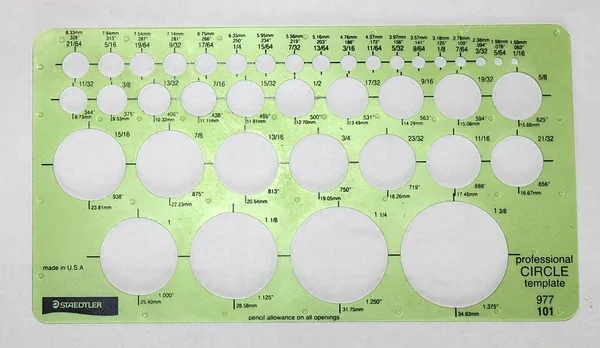 This tool is used for drawing common shapes, figures and symbols. It is a piece of plastic with cut-out symbols on it.