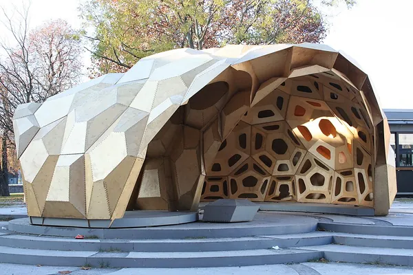 They used ideas from a water spider's nest to build this. It shows new ways to use robots in making buildings that waste less, cost less, and work better. The pavilion also makes good use of robotic fabric-making skills.