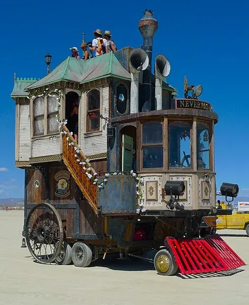 Burning Man is one of the largest art gatherings in the US. It attracts so many different sculptors, painters, dancers, musicians, and, of course, Steampunks.This is a great place to look for Steampunk design. Burning Man is one of the largest collections of Steampunk dirigibles (drivable sculptures), Fashion, and architectural designs.
