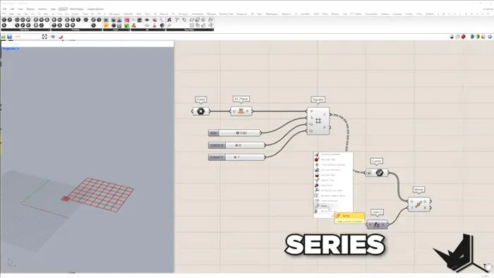Once we've created the base plane and the grid, we can move on. Now we'll create boxes which are based on each cell of the grid. To clarify, the height of the box has to be equal to the grid size. As attractors for the boxes, we will use the predefined curves that we now need to import.These maintain the boxes based on the distance of the box to the nearest curve. We'll need to calculate these distance. To do the calculation, we will extract the centres of the boxes and pull them to the attractors. The distance from the nearest curve has to be smaller than 16.8.